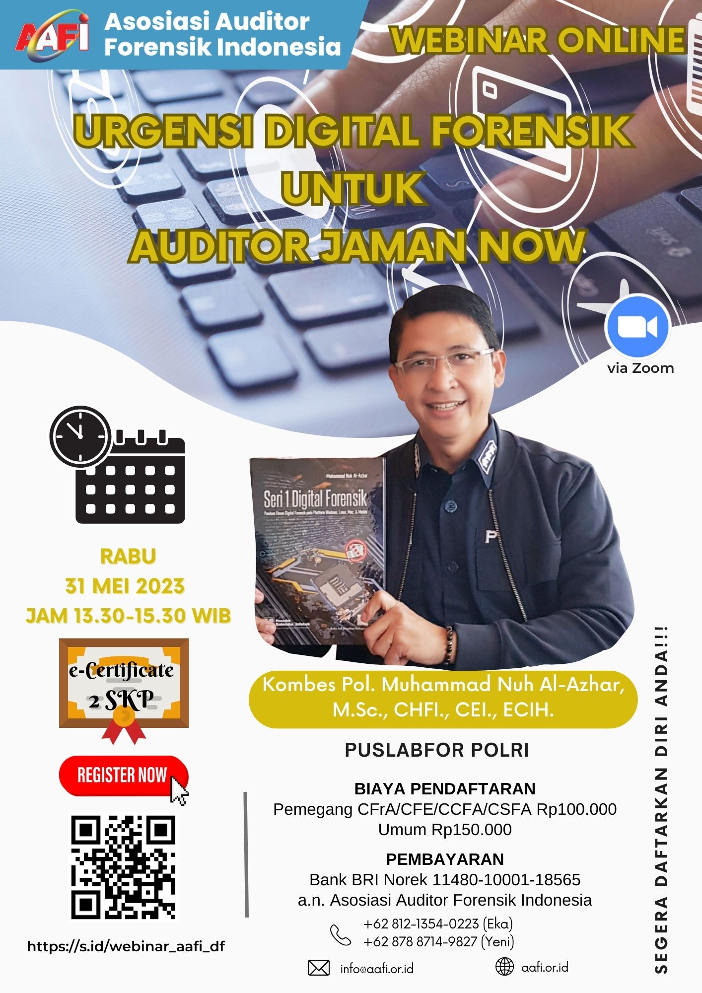 Asosiasi Forensik Auditor Indonesia (AAFI EKAPAME) mengundang Bapak/Ibu dalam Webinar Online dengan Tema "URGENSI DIGITAL FORENSIK UNTUK AUDITOR JAMAN NOW" yang menghadirkan Ahli Digital Forensik, Komisaris Besar Polisi Muhammad Nuh Al-Azhar, S.T., M.Sc., CHFI., CEI., ECIH. dari PUSLABFOR POLRI.