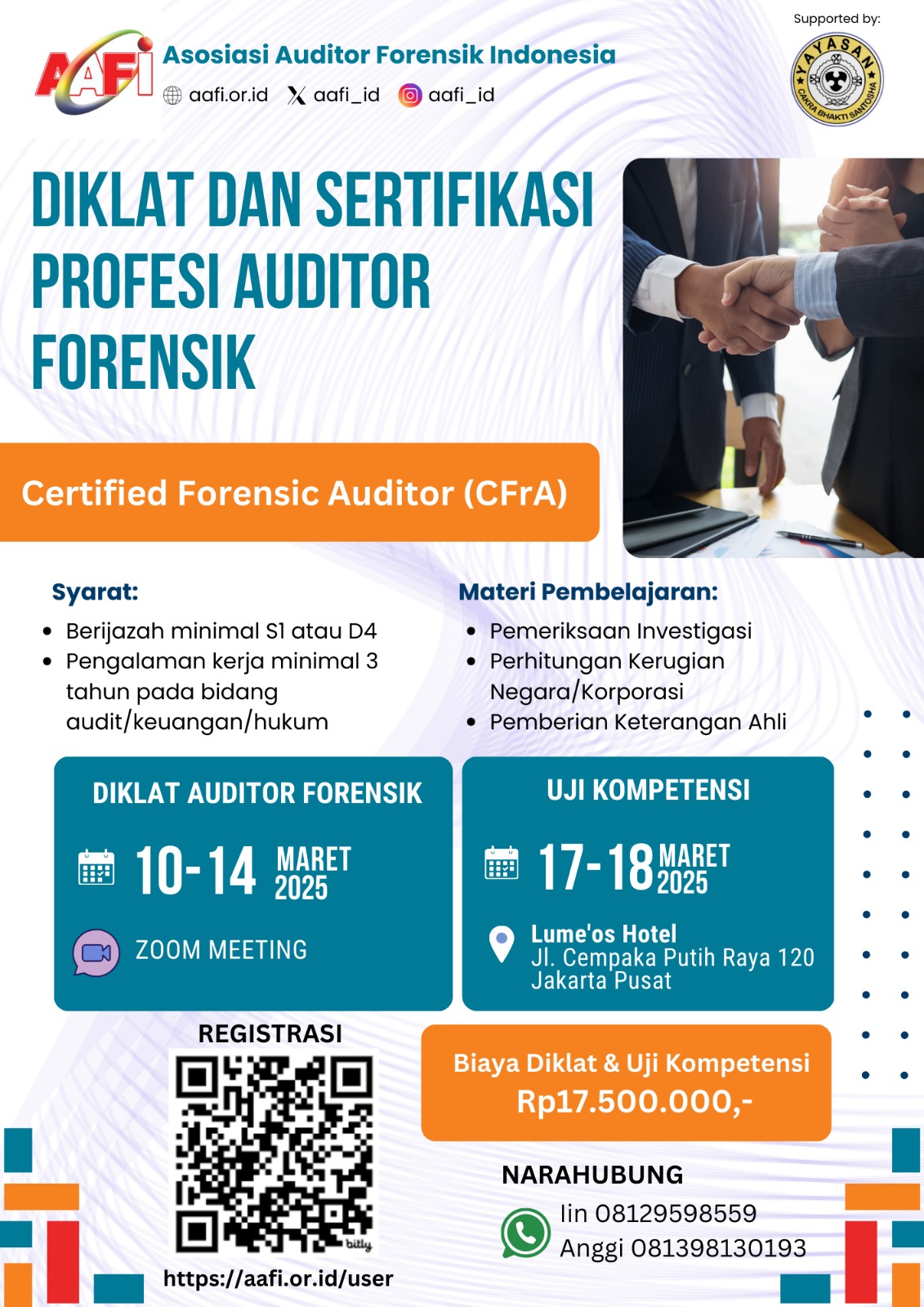 Biaya untuk mengikuti Diklat dan Uji Kompetensi ini sebesar Rp17.500.000,-. Pendaftaran dapat dilakukan melalui tautan https://aafiekapame.org/user atau dengan memindai QR Code pada flyer.